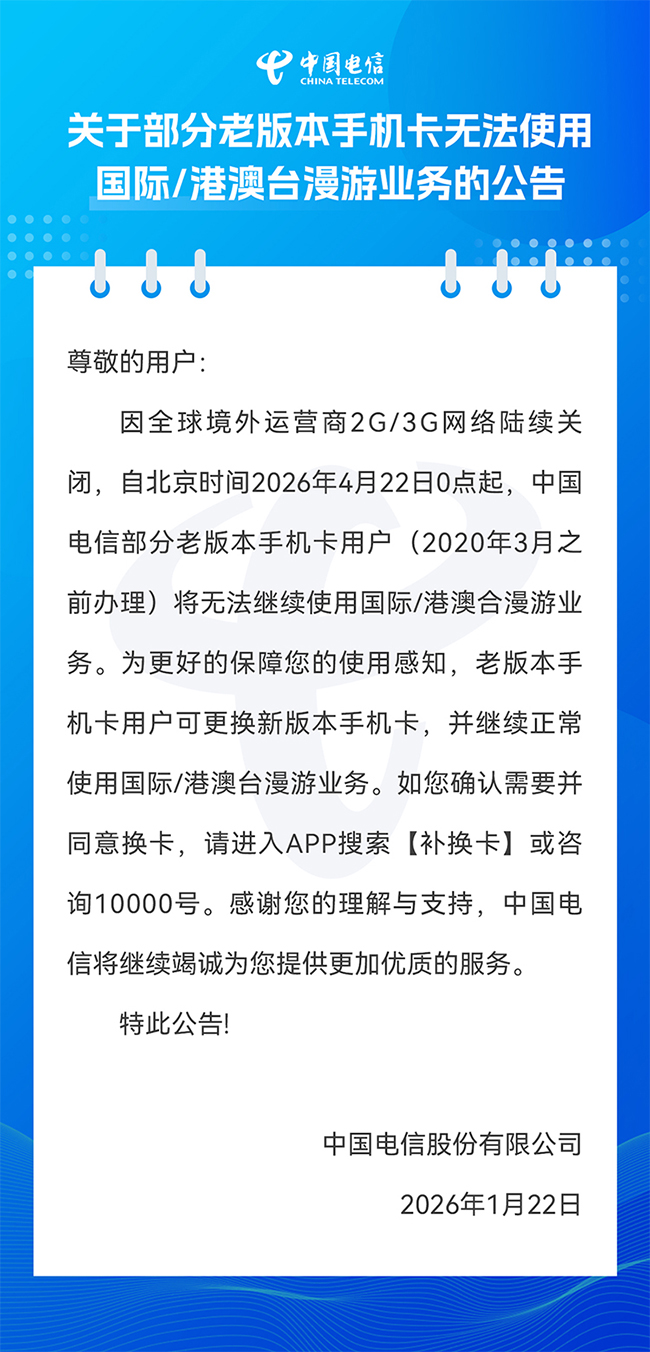 关于部分老版本手机卡无法使用国际及港澳台漫游业务的公告