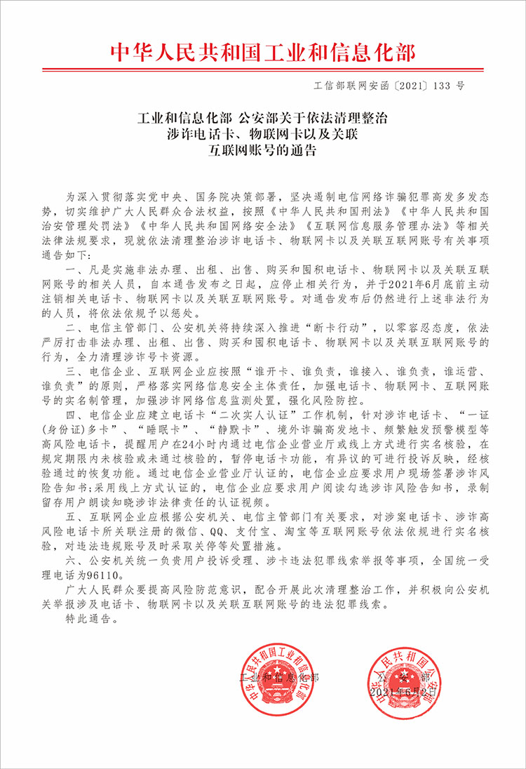 关于依法清理整治涉诈电话卡、物联网卡以及关联互联网账号的通告