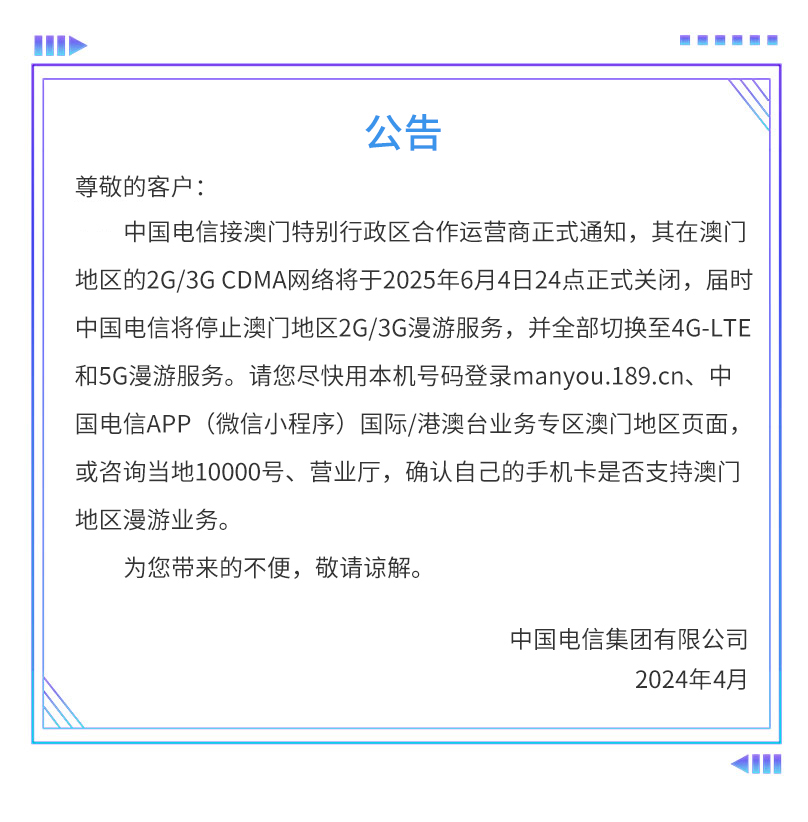 关于关闭中国电信CDMA国际/港澳台漫游业务的通知