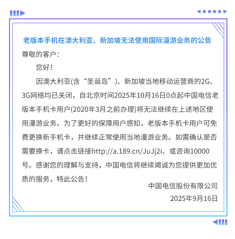 老版本手机在澳大利亚、新加坡无法使用国际漫游业务的公告