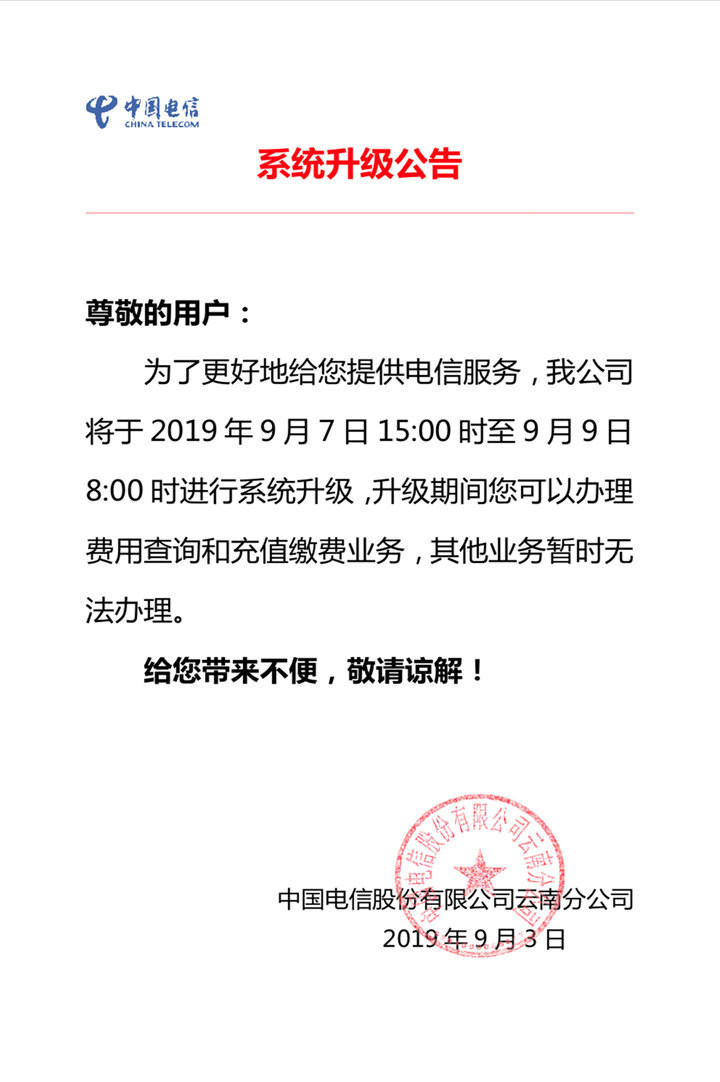 2、升级期间无法办理开户、业务变更、信息查询、充值缴费、实名制认证激活、宽带续约等业务;